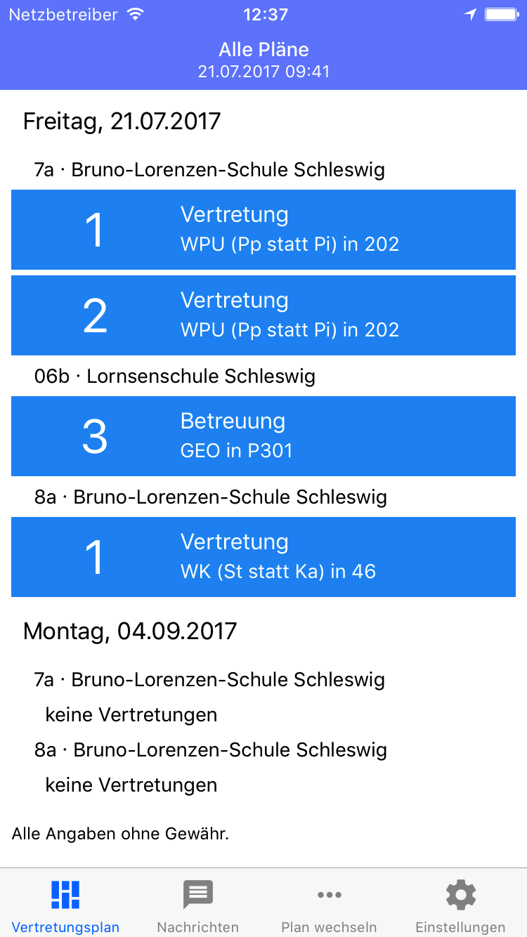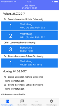 In den letzten Wochen haben wir Updates für die iOS- und Android-App veröffentlicht, die für die Nutzer der Pro-Version (entweder durch den In-App-Kauf oder die Schullizenz) eine neue Funktion beinhalten: Sofern mehrere nach unterschiedlichen Klassen oder Lehrern gefilterte Pläne ausgewählt sind, können diese nicht nur getrennt voneinander, sondern mit der neuen Option Alle Pläne auch gleichzeitig angezeigt werden. Damit hat man einen noch besseren Überblick über mehrere ausgewählte Pläne.